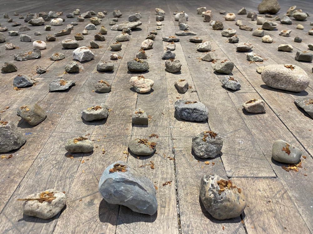 Mousse, branches, pommes de pin, feuilles et fleurs séchées s’ajoutent aux pierres qui, une fois semées, retracent l’histoire et la lignée des grands-pères de l'artiste. Au centre de la salle, 215 petites pierres sont minutieusement disposées et surmontées d’une pincée de tabac. Formant une mosaïque de moments ou de personnes, elles racontent une histoire sans date, sans mots et sans fioritures.