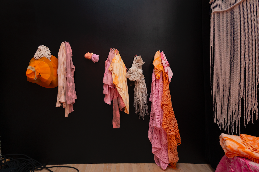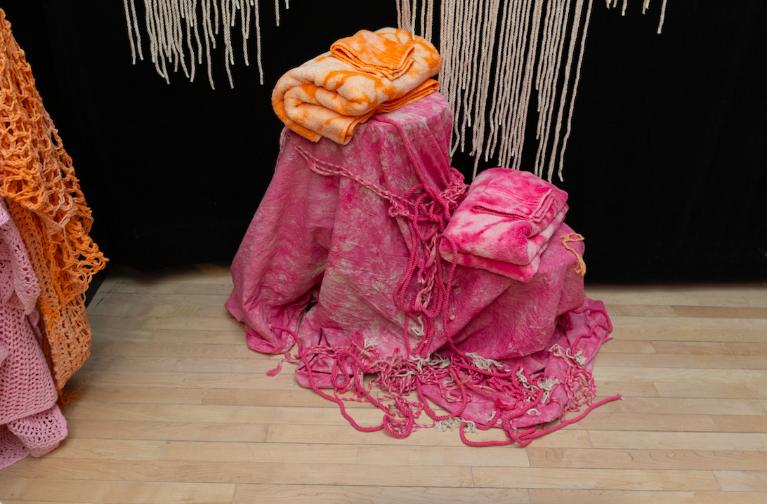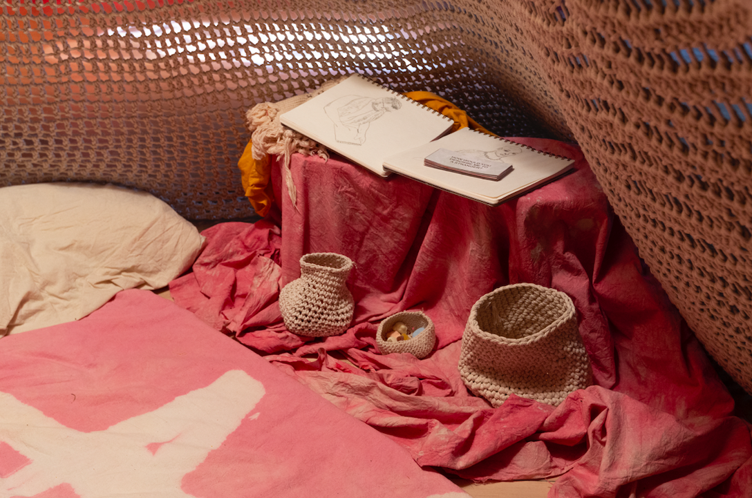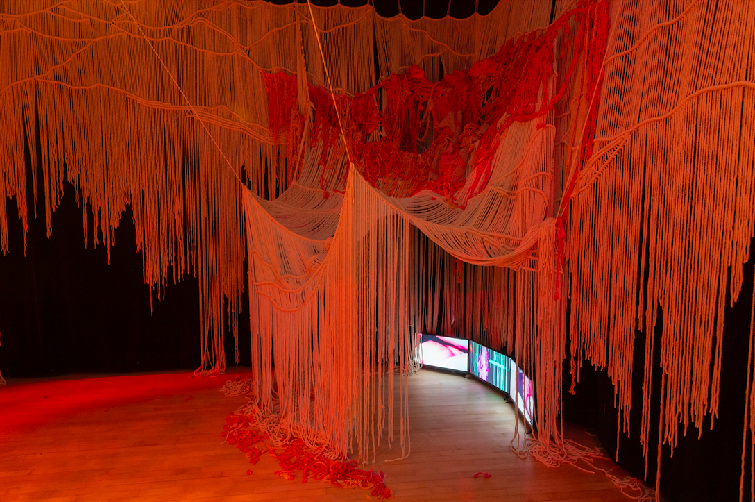 Les liens invite à une expérience multi-sensorielle et émotive plus que cérébrale. Un tracé lumineux nous guide jusqu’à une salle sombre aux parois recouvertes de diverses œuvres textiles évoquant le macramé, le crochet ou le tricot. Ces œuvres presque envahissantes, aux formats multiples et aux limites floues, tapissent l’espace, dessinent ici et là des paysages abstraits, ou évoquent plutôt des objets plus concrets. L’installation comprend par ailleurs des œuvres vidéos présentées sur de grands écrans, des projections lumineuses plus discrètes et un habillage sonore méditatif parcouru de sons organiques, chuintements ou frottements de corps en mouvement. L’espace tout en textures, à la fois étrange et douillet, produit l’effet d’une « caverne », d’un « cocon ». Les frontières entre les médiums artistiques sont fluides, et les différents dispositifs utilisés perdent leurs démarcations en participant de manière aussi organique, simultanée, à une même expérience artistique. Certains de ces dispositifs ont été développés en collaboration avec l’ingénieur électronique Luca Paris, qui cherche dans sa démarche à encourager « l’engagement du public ». Il y a de fait dans cette installation quelque chose d’enveloppant qui invite à s’immerger complètement et à se sentir partie prenante de l’expérience.