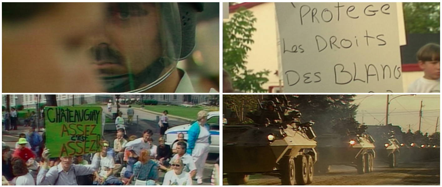 « J’ai su très tôt que j’utiliserais des extraits d’archives, parce que souvent la réalité dépasse la fiction. Je ne voulais pas que le public discrédite les moments plus laids en pensant que j’exagérais. Ces extraits d’archives ancrent et soutiennent la véracité de cette laideur », confie la cinéaste dans un entretien au Devoir. Œuvre sur l’endoctrinement par la fiction, Beans est en effet rythmé par quatre montages d’archives, essentiellement constitués de reportages télévisuels de l’époque, qui viennent documenter la progression du conflit armé, de sa formation jusqu’à sa conclusion (même si un tel schisme n’est jamais à proprement parler résolu). Et rien, au fond, n’est plus instructif que ces archives, car le didactisme à l’œuvre n’est pas celui des faits ou des dates, mais relève de la pédagogie intrinsèque de l’image et des représentations collectives. Comme le soutient Deer, l’archive médiatique nous donne accès au réel dans sa nudité (impossible de nier toutes les phrases affreuses qui sont prononcées dans ces extraits : elles ont bel et bien été dites) de même qu’à la manière dont ce réel a été interprété et mis en récit par les médias officiels.