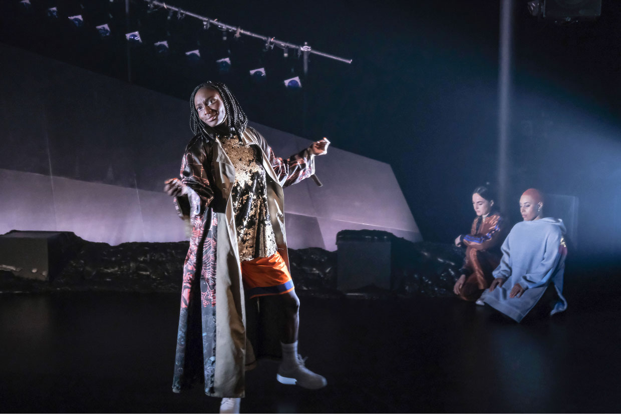 Ces pans d’histoire occultés et inconnus constituent autant de lieux à partir desquels réinscrire la mémoire des ancêtres, selon Monnet. Ainsi, dans le spectacle Marguerite : le feu, le personnage de Marguerite Duplessis se multiplie et se voit incarné par trois actrices pour former une Marguerite chorale à la fois Autochtone et Noire. Les trois comédiennes entrent en scène en scandant des paroles à l’unisson pour ensuite demeurer sur scène tout au long de la pièce. Minimaliste, la mise en scène laisse toute la place à des projections écraniques et à d’impressionnants jeux de lumière, qui font ressortir les tons de rouge et de cuivre des costumes. Le décor n’est qu’un sol noir fissuré en son centre, qui fait figure d’éruption volcanique. Aux abords du sol, des formes noires symbolisent la lave et la pierre, comme autant d’histoires enfouies, inscrites sur le territoire de la Martinique et Tiohtià:ke / Mooniyang (Montréal en langues kanien’kéha/mohawk et anishinaabemowin, respectivement).