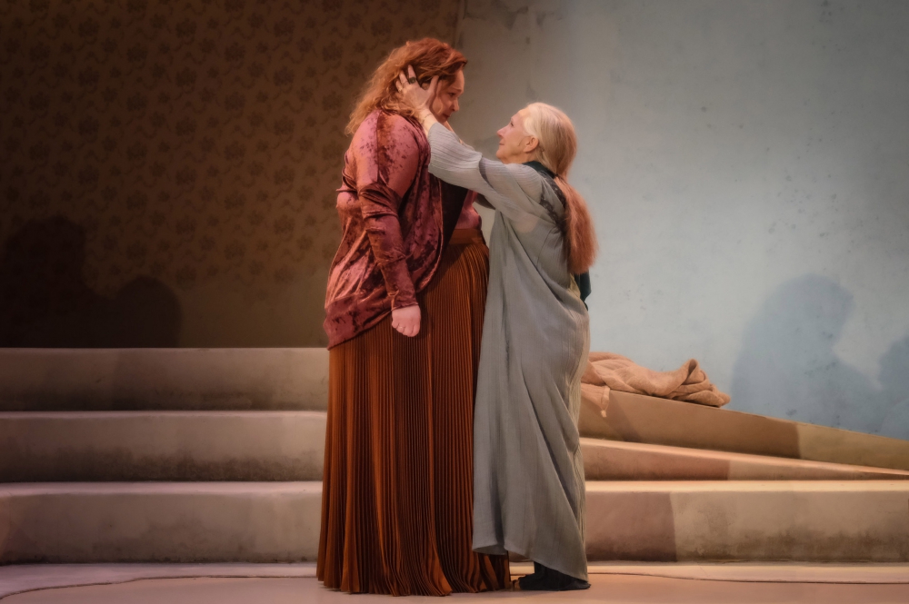 Reflet de ce lieu un peu délabré mais réconfortant, l’atmosphère de la mise en scène est chaleureuse. Ses tons de rose délavé renforcent autant cette impression de douceur que de décrépitude (le papier peint est beige et déchiré par endroits). Le décor, plus grand que nature, donne l'impression que les personnages sont des figurines dans une maison de poupées. Une estrade sert de divan ou de lit : tantôt Denise s’y repose, tantôt on s’y rassemble.