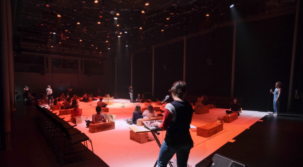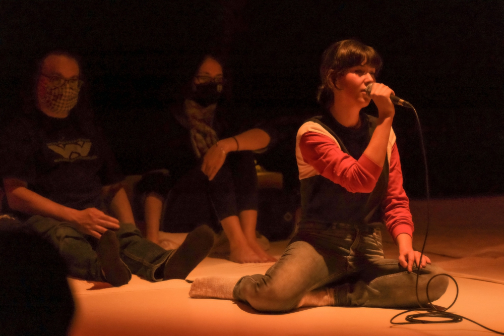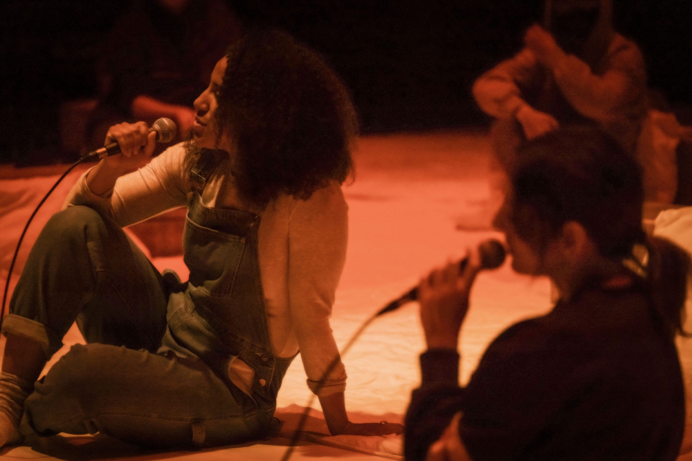 Nous nous installons alors à même le sol ou sur une des chaises qui ceignent l’espace de représentation. Mais « représentation » n’est peut-être pas le bon terme – les premières paroles du spectacle, d’ailleurs, nous le signalent : « Ici commence la représentation. [Souffle]. Temps. Ici finit la représentation ». Par l’abolition de la représentation et de la distance entre le spectateur et l’acteur, une relation d’horizontalité se tisse entre les gens présents dans la salle, instillant en nous un sentiment de partage, voire de communion. Les interprètes, qui se promènent parmi le public (on se laisse particulièrement atteindre par la présence magnétique d’Émilie Monnet), nous transportent dans les mythologies anciennes et récentes, qui nous sont tantôt chantées, tantôt racontées. Le rythme est juste assez lent pour permettre aux paroles de se déposer en nous et laisser éclore le germe d’une question.
