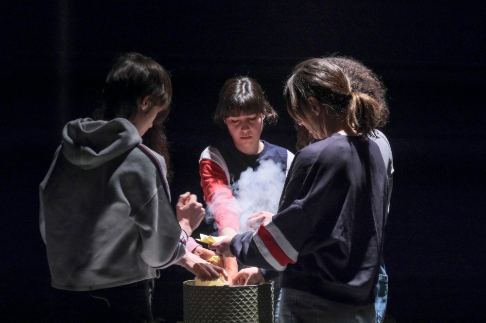 Idéation, musique, texte et mise en scène : Mykalle Bielinski ; Interprètes : Mykalle Bielinski, Florence Blain Mbaye, Laurence Dauphinais, Elizabeth Lima, Émilie Monnet ; Dramaturgie : Sophie Devirieux ; Scénographie : Odile Gamache ; Conception sonore : Colin Gagné ; Conception lumières : Hugo Dalphond ; Direction de chœur : Mélodie Rabatel ; Mentorat au mouvement : Mélanie Demers ; Direction technique : Guillaume Lafontaine-Moisan + Claudie Gagnon ; Régie : Charlotte Isis Gervais + Gaspard Philippe. Spectacle présenté à l’Espace Go du 26 avril au 14 mai.
