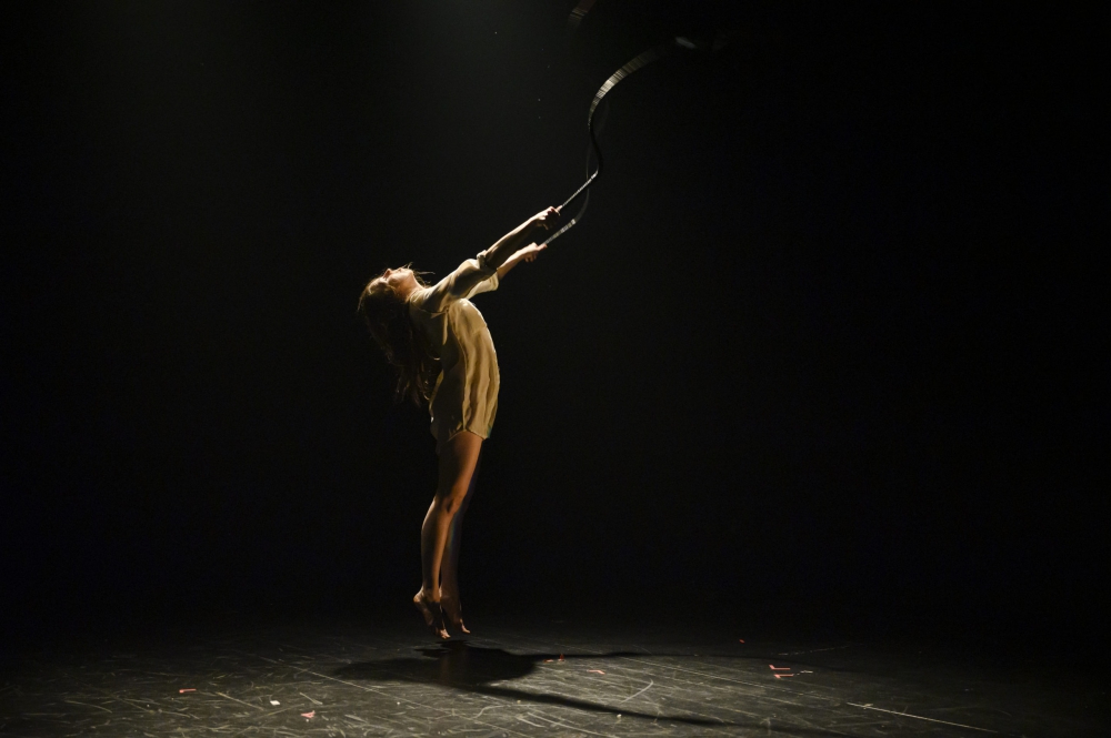 Dans la pénombre, une femme est placée en posture inversée, tête en bas et jambes en l’air. Elle est nue. Lentement, elle écarte grand les cuisses, découvrant ainsi son sexe duquel s’extrait une rose. Silence dans la salle. Raidi au bord des sièges, le public semble totalement ébahi par cette nudité décomplexée, devenue pur matériau, et par la prouesse de l’athlète. Apparaît dès lors sur scène la faucheuse, bien décidée à mettre un terme sanglant au spectacle. Mais la voilà hypnotisée à son tour par cette beauté brute et sublime, offerte à la vue de tous et toutes. À défaut d’en dérober la vie, la Mort « déflore » la femme, puis sort.