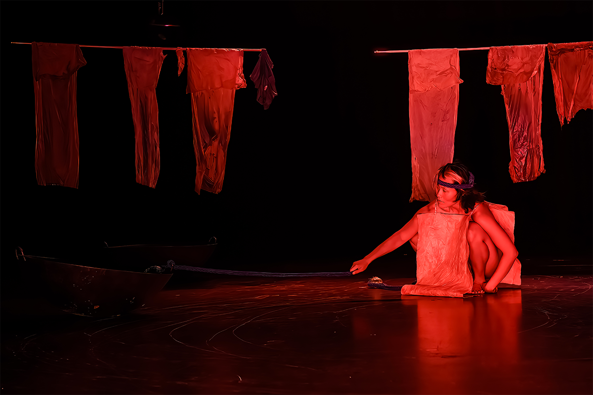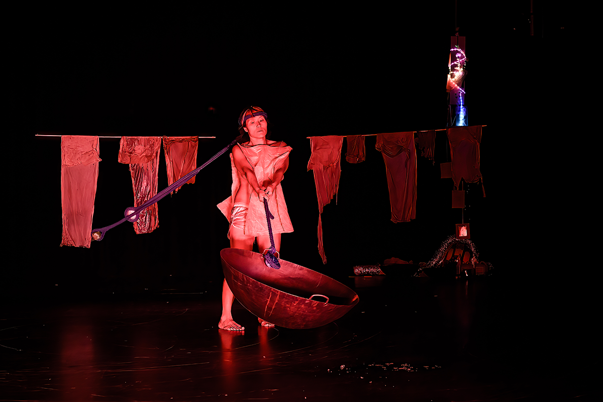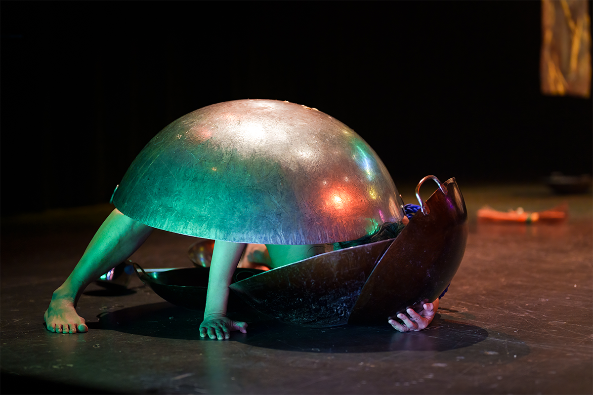 Wo se présente dénudée, dos musclé, cuisses solides, entrecuisses et bassin occupés par un énorme wok de cuivre, tourné comme une antenne parabolique vers le public. Elle rampe au sol, promène cet étrange attirail qu’elle frotte avec des fouets de paille traditionnels. C’est ainsi la communauté qui est appelée au repas cannibale de son identité. Elle se love ensuite dans cet instrument, tournant la coque comme une carapace de tortue. Le corps, involutif, régresse à l’état de fœtus. C’est fascinant, beau, étrange, sans action ni développement, pures images d’une célébration en cours, à contempler.