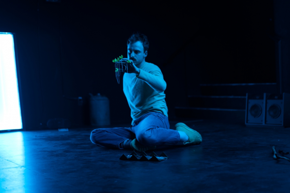 Le spectacle s’ouvre sur le corps nu de Charles Voyer, totalement investi dans cette performance rythmée et nuancée, et ce, dès les premiers instants ; il rampe, émerge des ténèbres à la façon d’un animal blessé. Dans les minutes qui suivent, il se lance dans un récit allégorique qui emprunte au style des contes merveilleux : ceux d’ogres mangeurs d’enfants, ou encore celui du Petit chaperon rouge, souvent interprété comme une allégorie du viol. Le conte que propose ici Voyer prend place dans une forêt enchantée et met en scène une bête, nommée Innocence, qui périra de la main d’un Gardien – une manière habile d’introduire les thèmes de l’enfance et de la violence qui traverseront tout le spectacle.