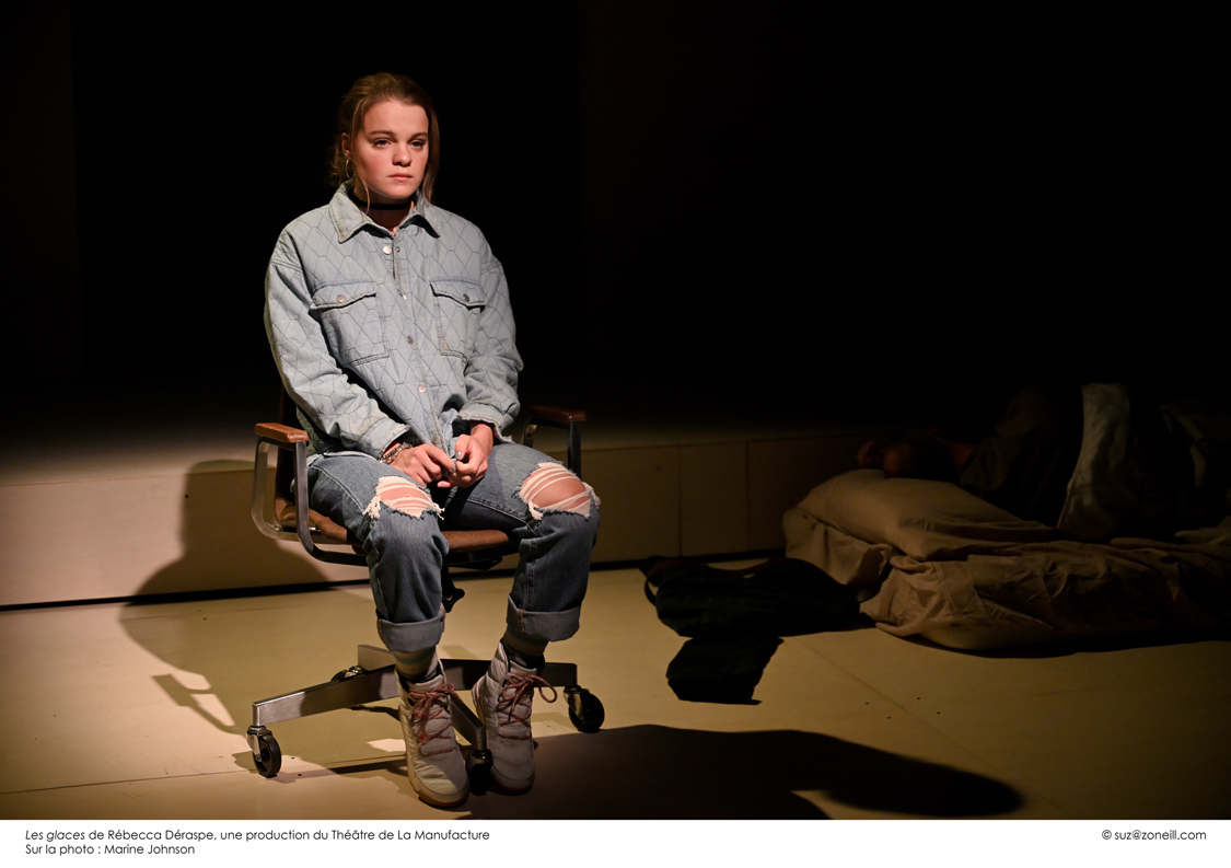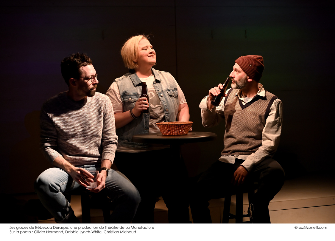 Les Glaces, Texte : Rébecca Déraspe. Mise en scène : Maryse Lapierre. Avec Anna Beaupré Moulounda, Daniel Gadouas, Marine Johnson, Valérie Laroche, Debbie Lynch-White, Christian Michaud et Olivier Normand. Musique : Chloé Lacasse. Production : Théâtre de La Manufacture et Théâtre La Bordée. Du 4 octobre au 5 novembre au théâtre La Licorne. En janvier au théâtre de la Bordée.
