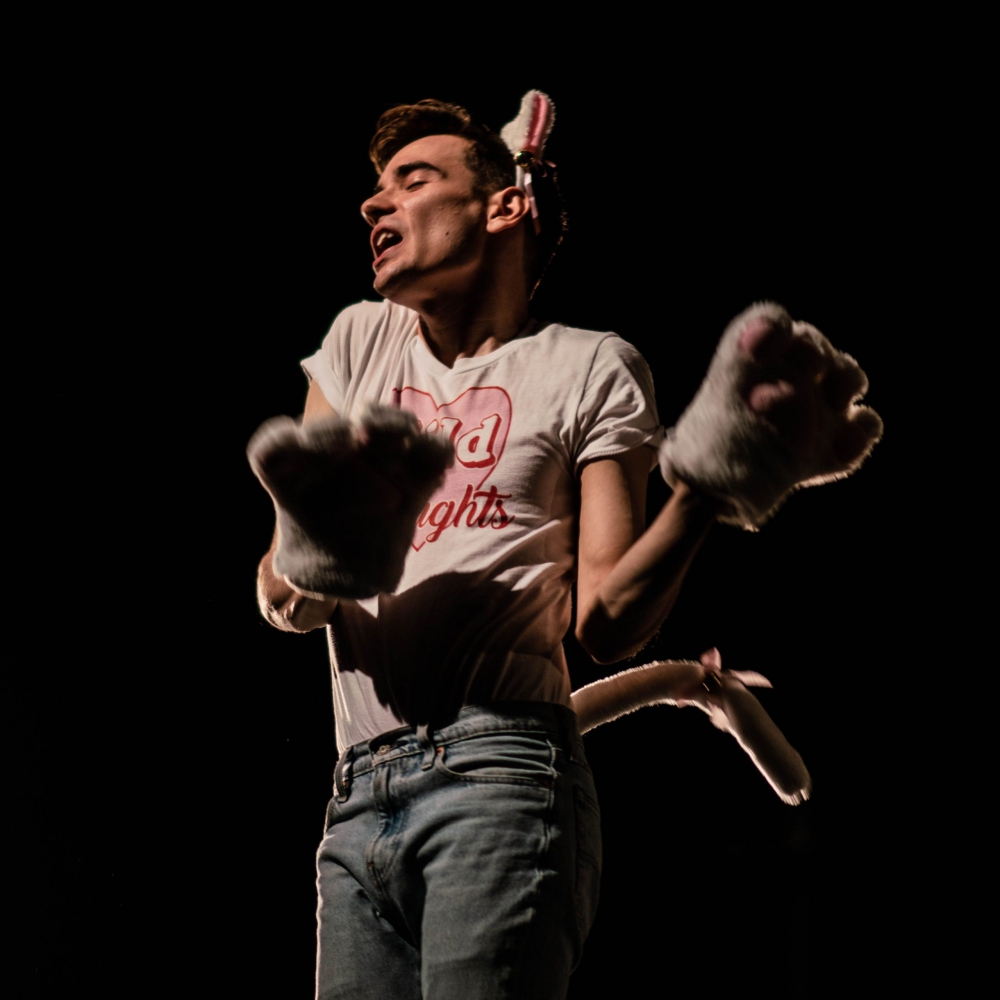 Le dispositif scénique, d’une grande simplicité, rend compte d’un autre enjeu de Good boy : l’imbrication des plans de perception et la confusion de la réalité et du fantasme. Une régie à vue, côté jardin ; au centre du plateau, une chaise et une table, sur laquelle est posé un déguisement de chat au kitsch assumé ; côté cour, la reproduction d’un tableau de Modigliani, « La femme à la cravate noire ». Sont ainsi présents, d’emblée, deux motifs obsédants de l’œuvre : le chat blanc, T. Gondii, qui ne cesse de faire irruption dans le roman, charriant avec lui tout un imaginaire de la contamination, et les regards énigmatiques dessinés par le peintre italien, qui hantent le narrateur depuis l’enfance. La chanteuse pop Rihanna, troisième figure récurrente de Good Boy, apparaîtra plus tard, à travers des épisodes où elle se transforme en médecin disséquant le héros, mais aussi à travers des séquences musicales durant lesquelles Antoine Charbonneau-Demers performe ses clips avec un mimétisme corporel saisissant. Le fantasme vire alors à la possession et le spectacle épouse la progression du récit qui, partant d’un contexte réaliste, bascule peu à peu dans un univers cauchemardesque : suivant les pires scénarios conspirationnistes, des forces occultes régissent les destins individuels.